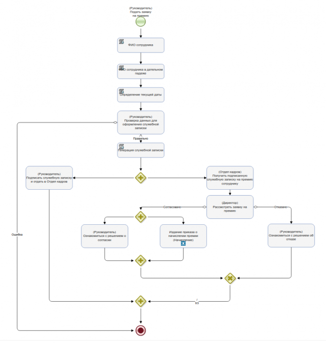 Если законы или технологии не соблюдены, то бизнес-процесс сообщает руководителю и подавшему заявку сотруднику о несоблюдении технологий. Далее процесс завершается.