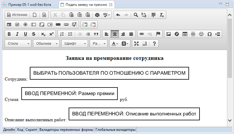 Для переменных "Размер премии" и "Описание выполненных работ" добавьте валидатор "Обязательное поле" (см. Практическое занятие "Изучение перспективы операций", Пункт 15, рис. 5.27, 5.28).