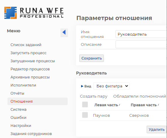 - Создайте в системе Runa-WEB отношение "Руководитель" (См. пример создания отношения в пунктах 10-11 раздела "Практическое занятие "Изучение перспективы ресурсов", рис. 3.5, 3.6). Откройте отношение "Руководитель" и создайте пару "Паучков"-"Сверчков" (Рис.2.02).