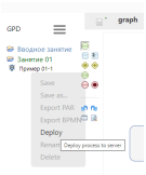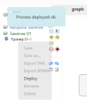 9. Загрузите разработанный бизнес-процесс в раздел «Запустить процесс». Для этого щёлкните правой кнопкой на разработанный бизнес-процесс и в выпавшем меню выберите команду "Deploy" (Рис. 2.09). В случае удачного переноса процесса будет выдано временное сообщение «Process deployed ok» (Рис. 2.10).